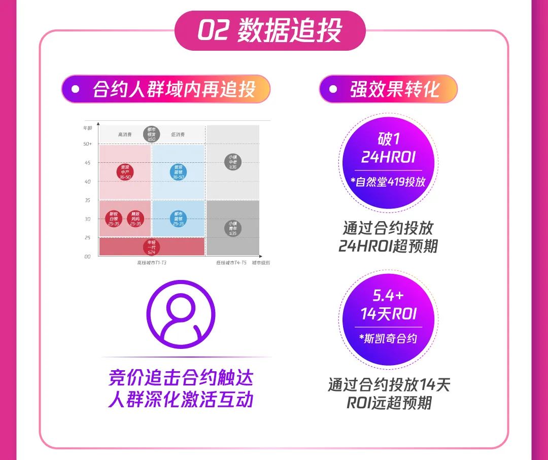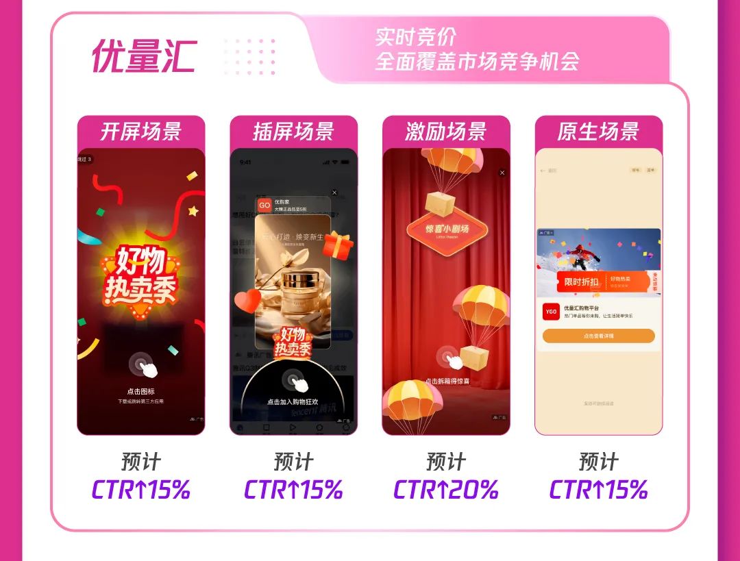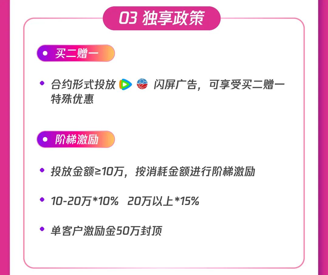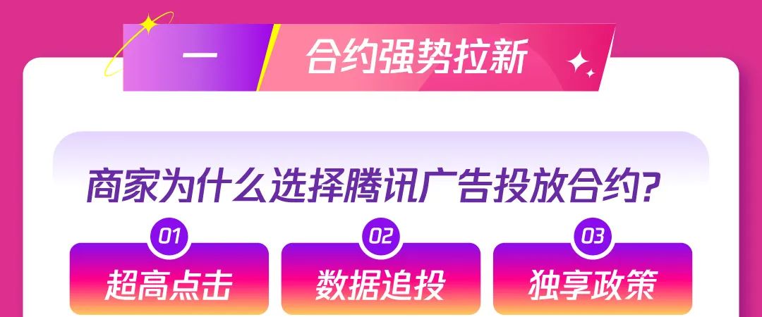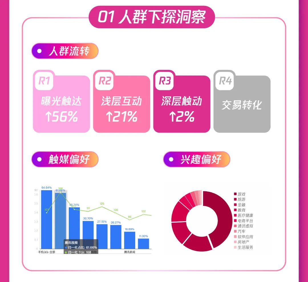 1)合约强势拉新:腾讯广告升级广告形态,多场景创意互动带来超高点击率和超强转化,娱乐、资讯等多场景+闪屏、贴片等多形式,加大站外新客引入,助推产品曝光;通过数据能力共建,实现广告追投,最大化人群价值利用,加速促进高意向用户人群转化。