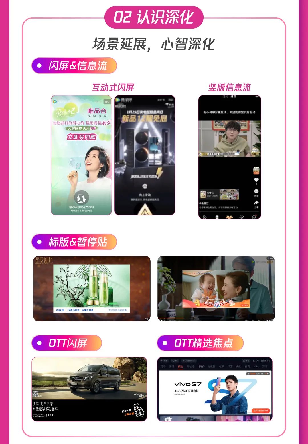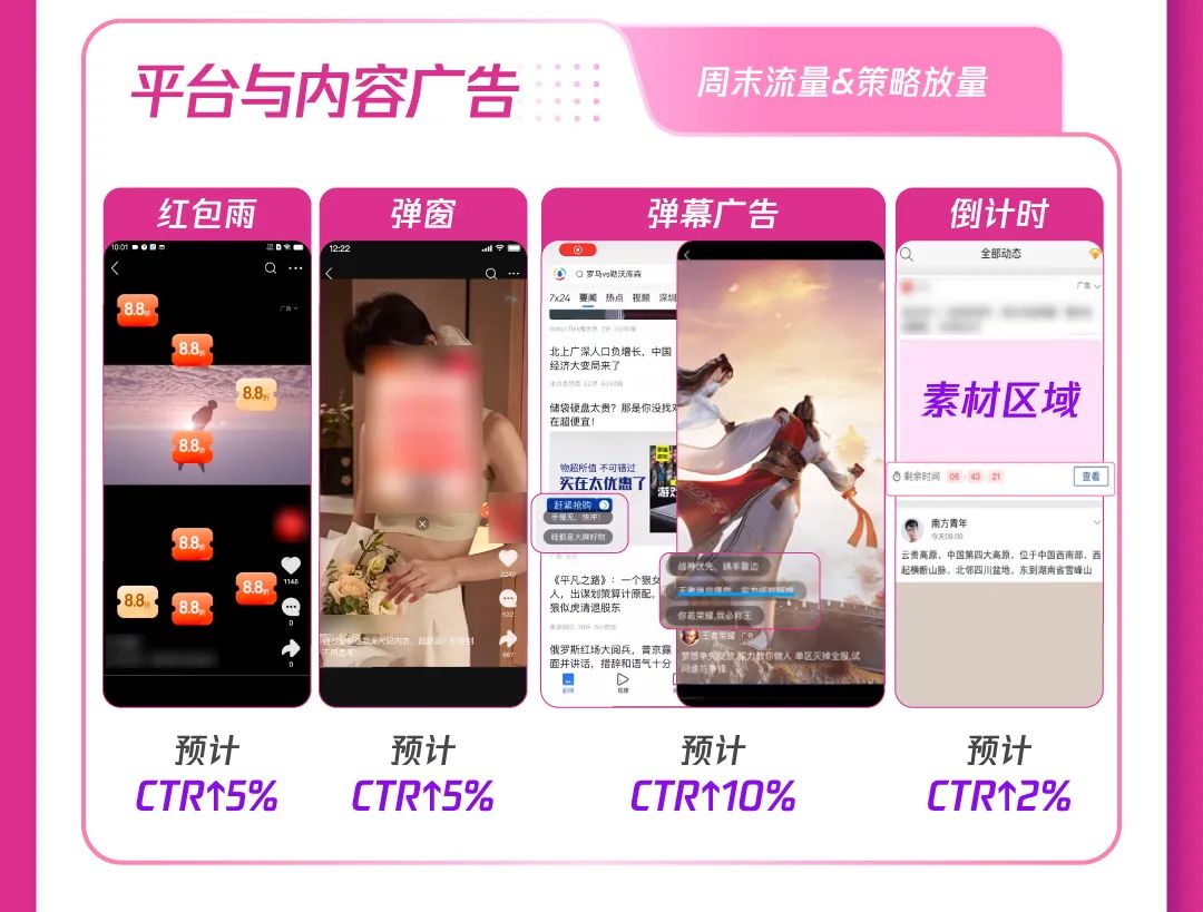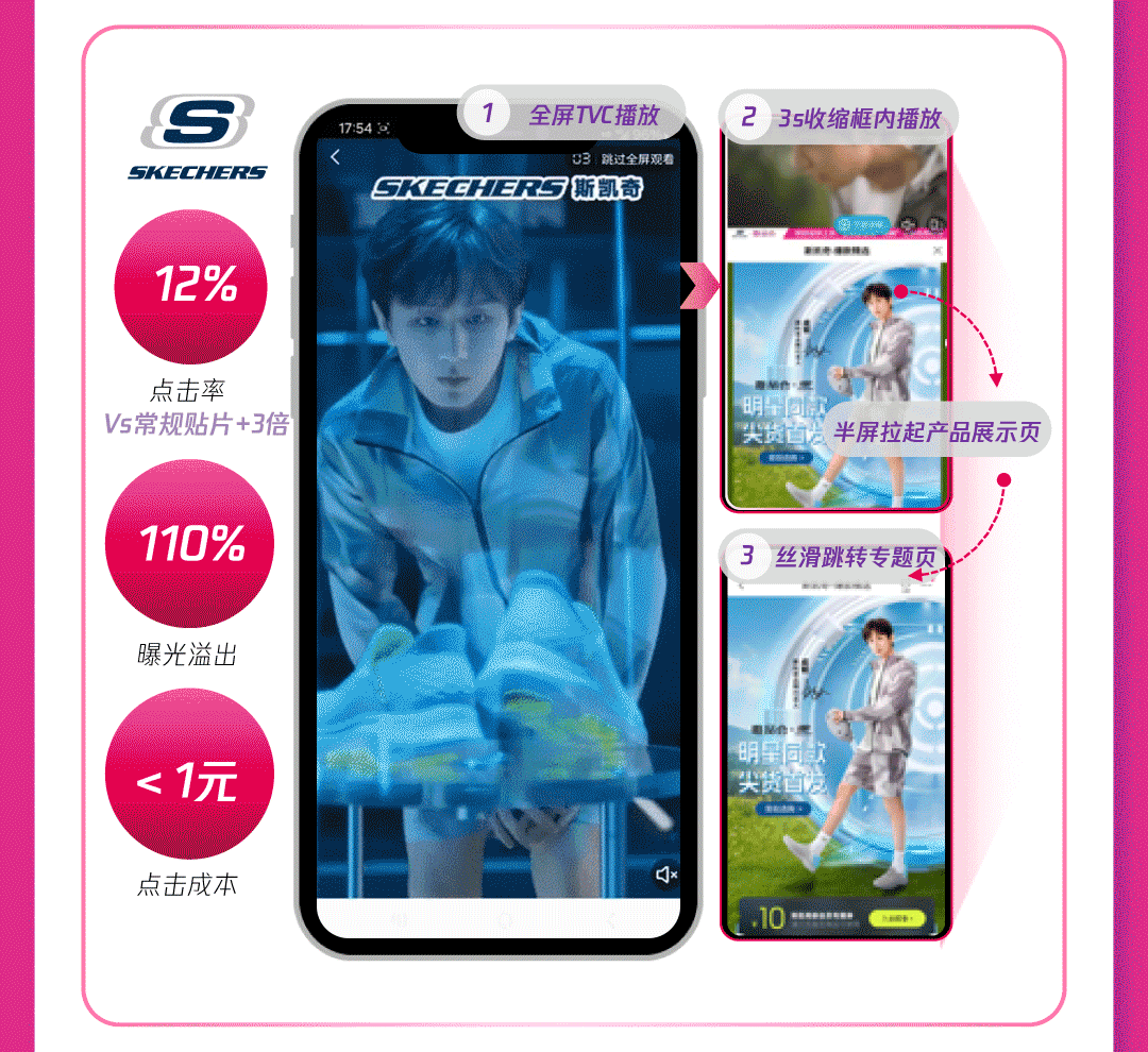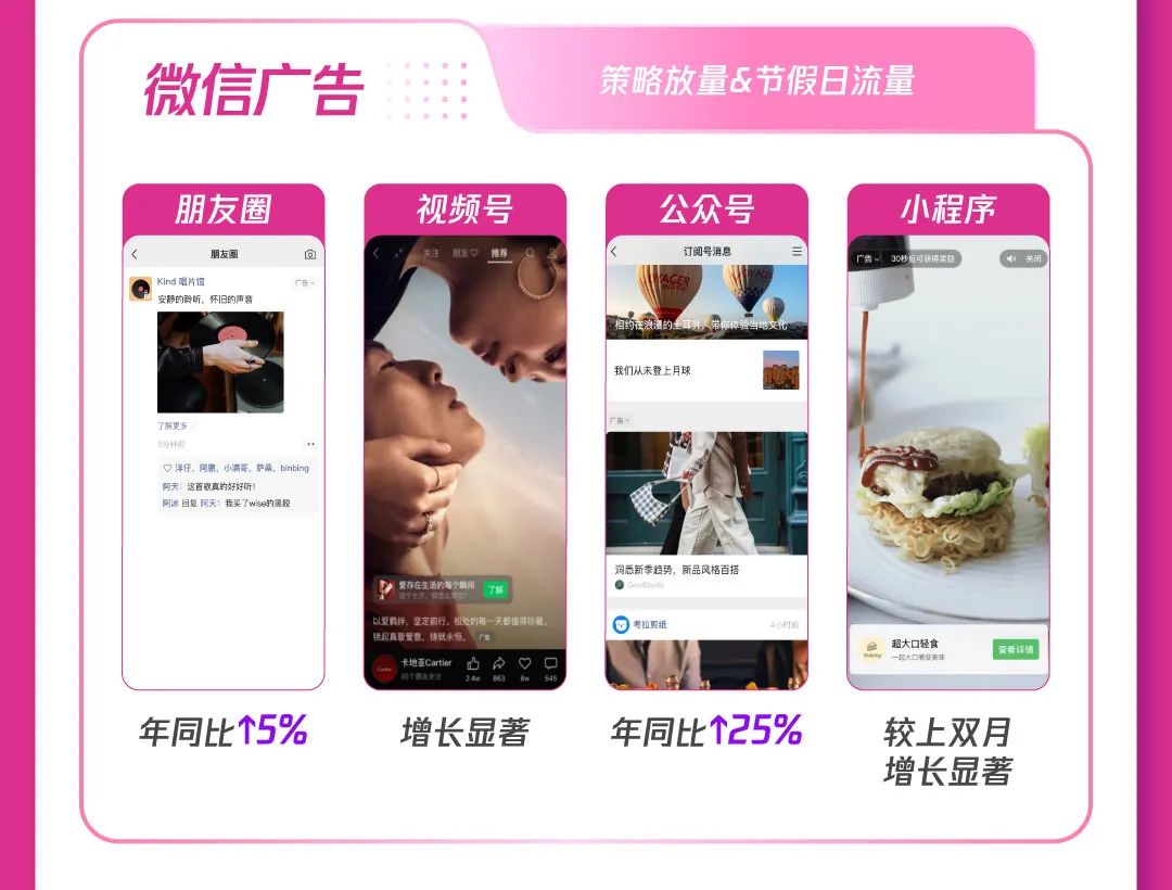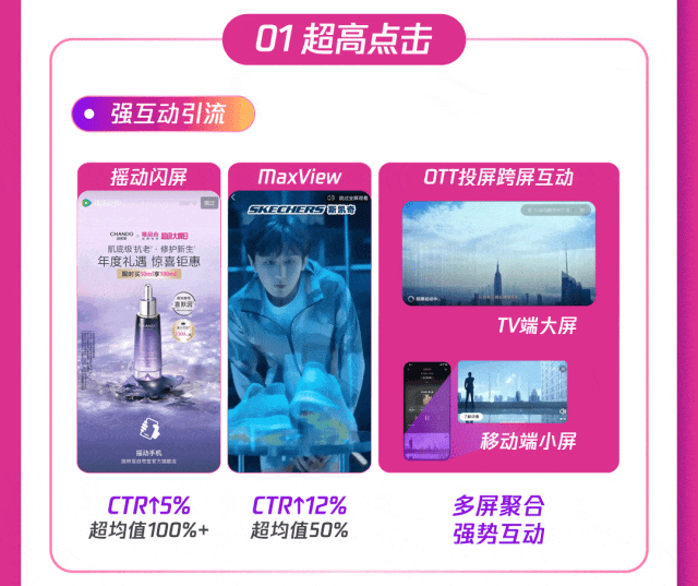 1)合约强势拉新:腾讯广告升级广告形态,多场景创意互动带来超高点击率和超强转化,娱乐、资讯等多场景+闪屏、贴片等多形式,加大站外新客引入,助推产品曝光;通过数据能力共建,实现广告追投,最大化人群价值利用,加速促进高意向用户人群转化。