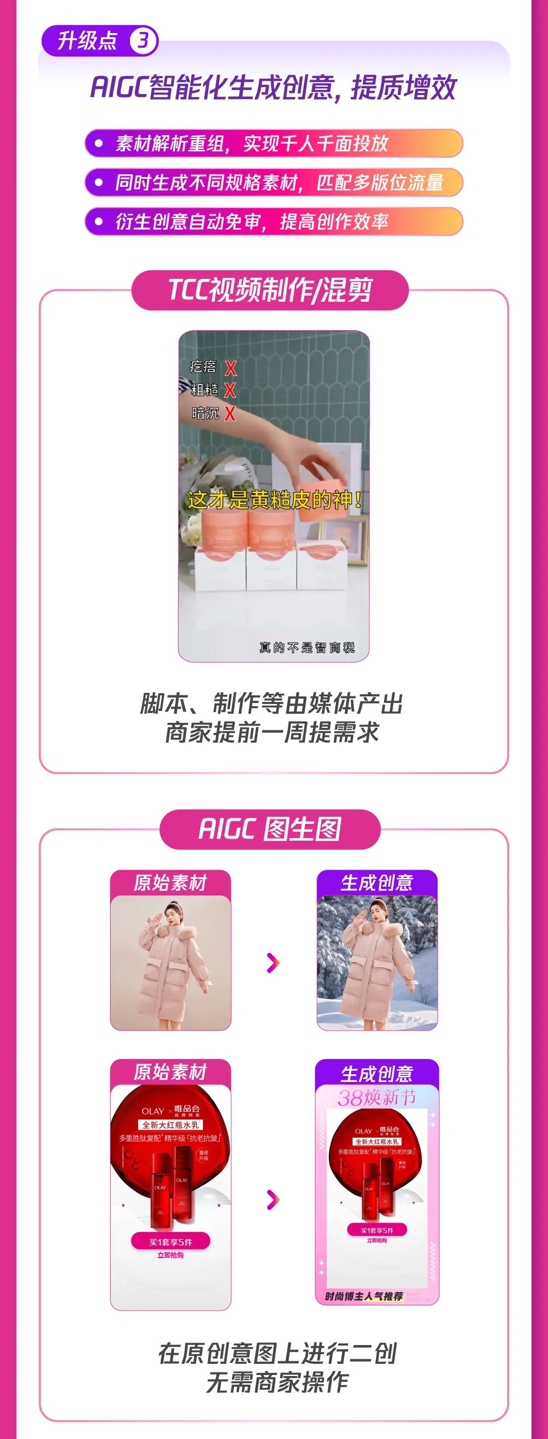 大促期间流量竞争激烈,如何抢先占领流量高地?对此,腾讯广告持续扩展流量场景库存,微信广告、平台与内容广告、腾讯优量汇三大核心流量阵地持续放量,撬动数亿级流量增长;同时,大促系统模型等产品能力全面升级,助力大促高效投放提升ROI;此外,AIGC妙思能力助攻,高效产出匹配多流量版位创意素材,提升广告投放效果,提升转化。